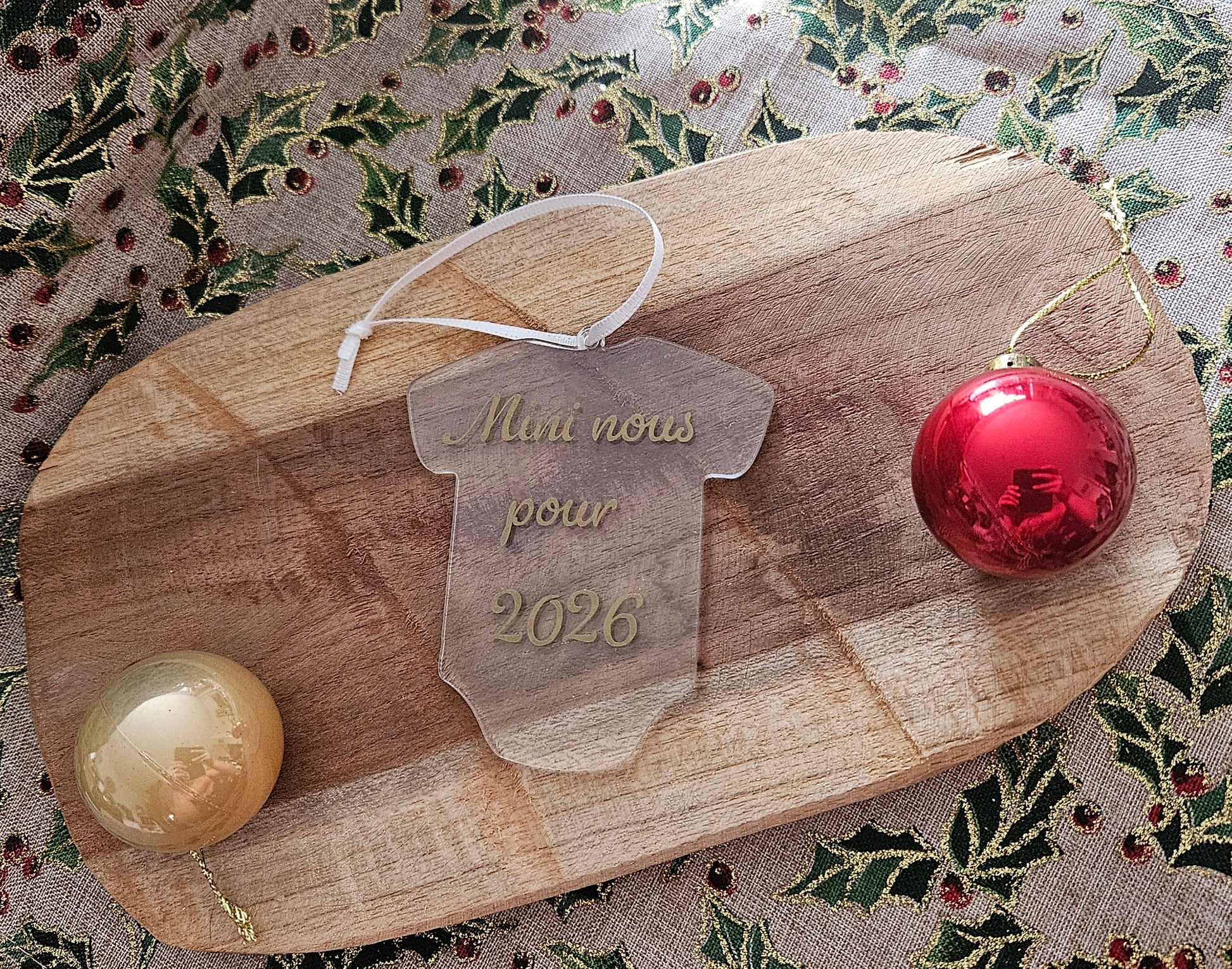 Faites de la magie de Noël un moment inoubliable avec cet ornement en forme de petit body, parfait pour annoncer une grossesse d’une façon tendre et originale. Suspendu dans le sapin, il attire immédiatement le regard et crée une émotion unique lors de la découverte du message.